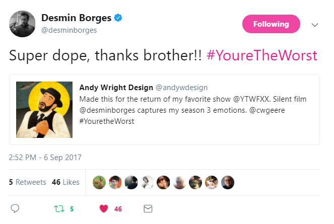 I created this for the Season 4 premiere of "You're The Worst" on FXX. I'm really happy with how it turned out. It was pretty popular on twitter. The actor, Desmin Borges, retweeted it. I'm glad he liked it. :)
